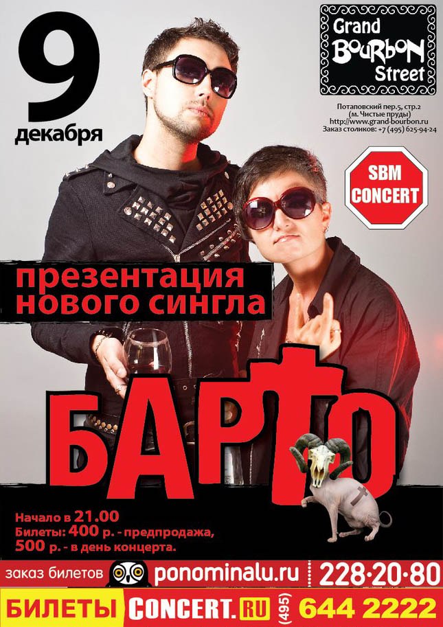 На нашем сайте представлена самая полная афиша концертов группы Барто в Москве и Санкт-Петербурге. Ознакомиться с расписанием своих любимых артистов вы можете в разделе "Билеты".