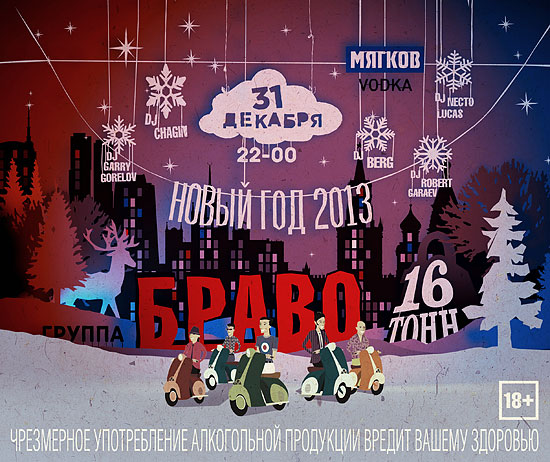 Новый год с группой «Браво»! А ТАКЖЕ DJ CHAGIN, DJ BERG, DJ GARRY GORELOV, DJ ROBERT GARAEV, DJ NECTO LUCAS. Билеты от 3000 рублей.