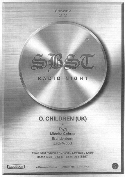 SBST Radio Night в клубе «Солянка». Программа вечеринки: SBST RADIO NIGHT w/ O.CHILDREN (live, UK), Труд (live), Midnite Cobras (live), Brandenburg (live), Jack Wood (live), Taras 3000, Vtgnike, Grishin, Low Bob, KrLow, Racho (SBST), Карен Саркисов (SBST).