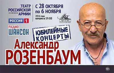 1 ноября 2016 (а также 28 октября, 29 октября, 30 октября, 2 ноября, 3 ноября, 4 ноября, 5 ноября и 6 ноября) в Театре Российской армии пройдут юбилейные концерты Александра Розенбаума.