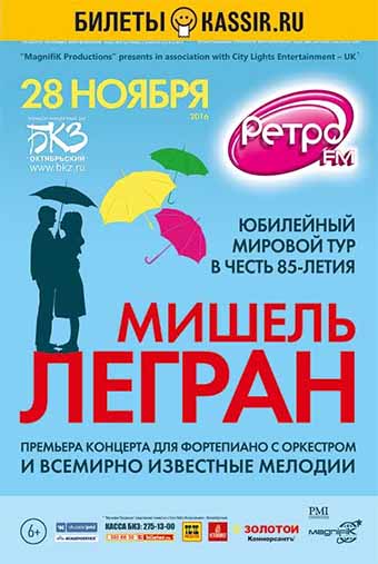 28 ноября 2016 в БКЗ Октябрьский выступит французский композитор, пианист, аранжировщик — Мишель Легран. Концерт пройдет вместе с симфоническим оркестром в рамках 85-летия Маэстро.